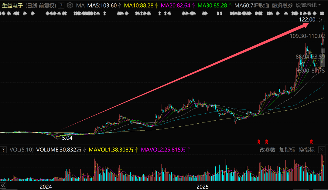 回看生益电子股价走势图,2024年初一度跌到5元左右,如今一度涨到122元,短短20个月翻了23倍,可谓超级一匹横空出世的超级大黑马。