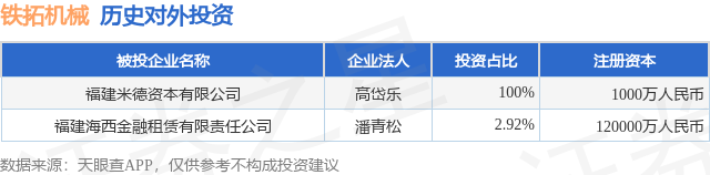 本站消息,根据天眼查APP显示,铁拓机械(873706.BJ)新增一起对外投资事件,被投资公司为福建米德资本有限公司大盈家,法定代表人高岱乐,投资占比为100%。该公司从事资本市场服务,注册资本为1000万人民币。目前大盈家,铁拓机械共存在对外投资2项,详见下表: